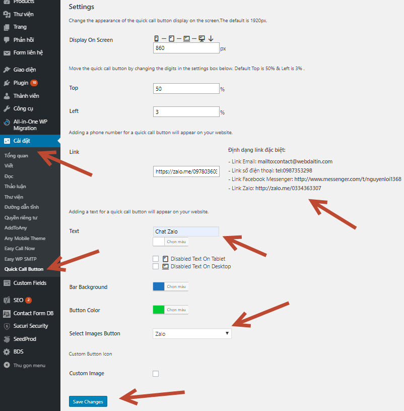 Bước 3: Hướng dẫn cấu hình hiển thị Chat Zalo